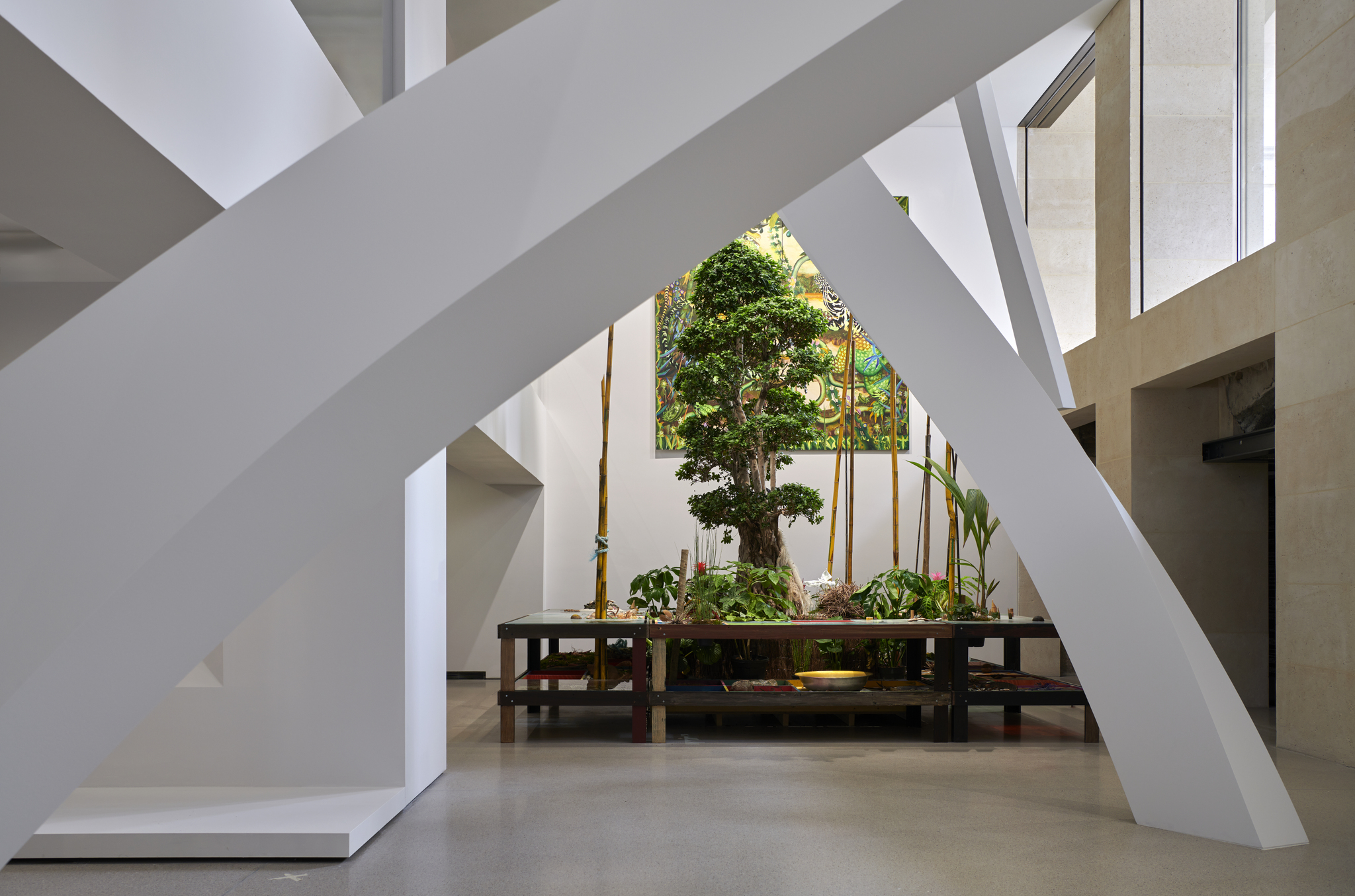 Vue d’exposition. Fondation Cartier pour l’art contemporain, 2025. Bruno NovelliTerra Maravilhosa, 2023 / Chaco artists / Nikau HindinAumoana – Nā Hanauna a Hina’ea, 2023-2024 & Aumoana – Manu Ngārahu, 2023-2024 / Junya IshigamiSydney Cloud Arch, 2015 – Photo © Marc Domage