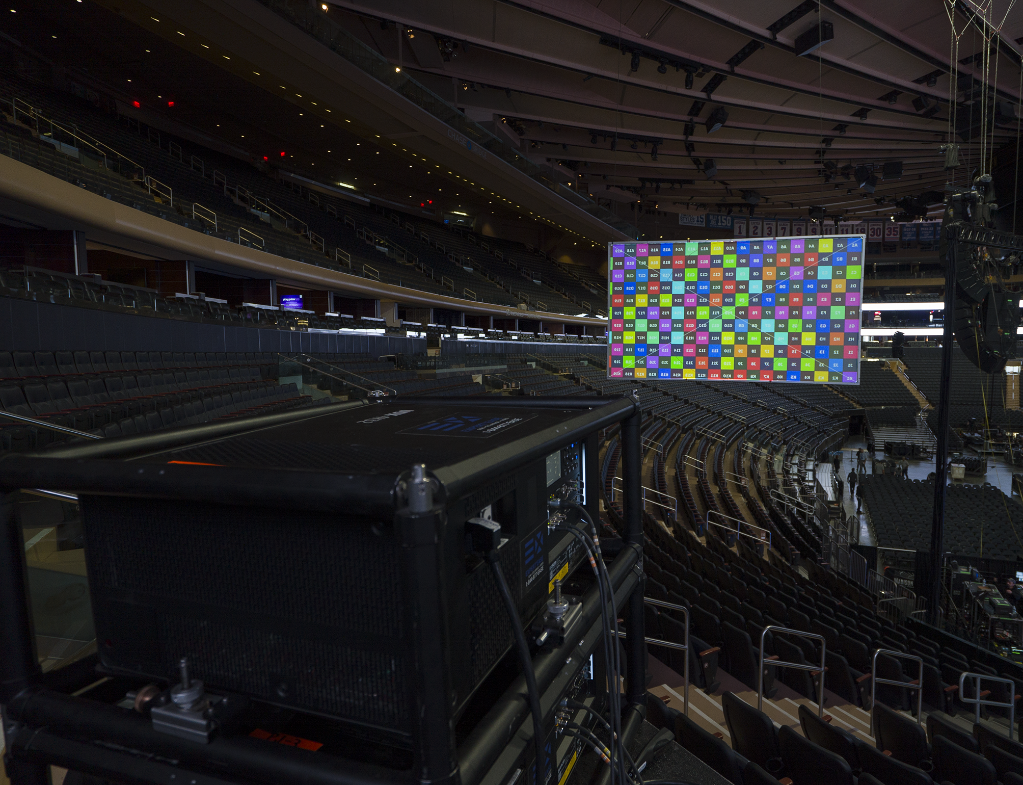 La scénographie reposait sur un mur LED central ROE Visual de 15 m x 6 m installé en fond de scène et offrant une résolution de 2496 x 1040 pixels. Deux murs LED latéraux d’environ 7,5 m x 4 m complétaient le système de projection. En fonction du kit disponible dans les salles lors de la tournée, ces murs latéraux étaient parfois remplacés par un système d’écrans de projection, chacun géré par deux projecteurs en configuration dual. L’ensemble était alimenté par un média serveur Modulo Kinetic de Modulo Pi, avec une station de travail Kinetic Designer reliée à deux serveurs V-Node, un serveur principal et un de secours.