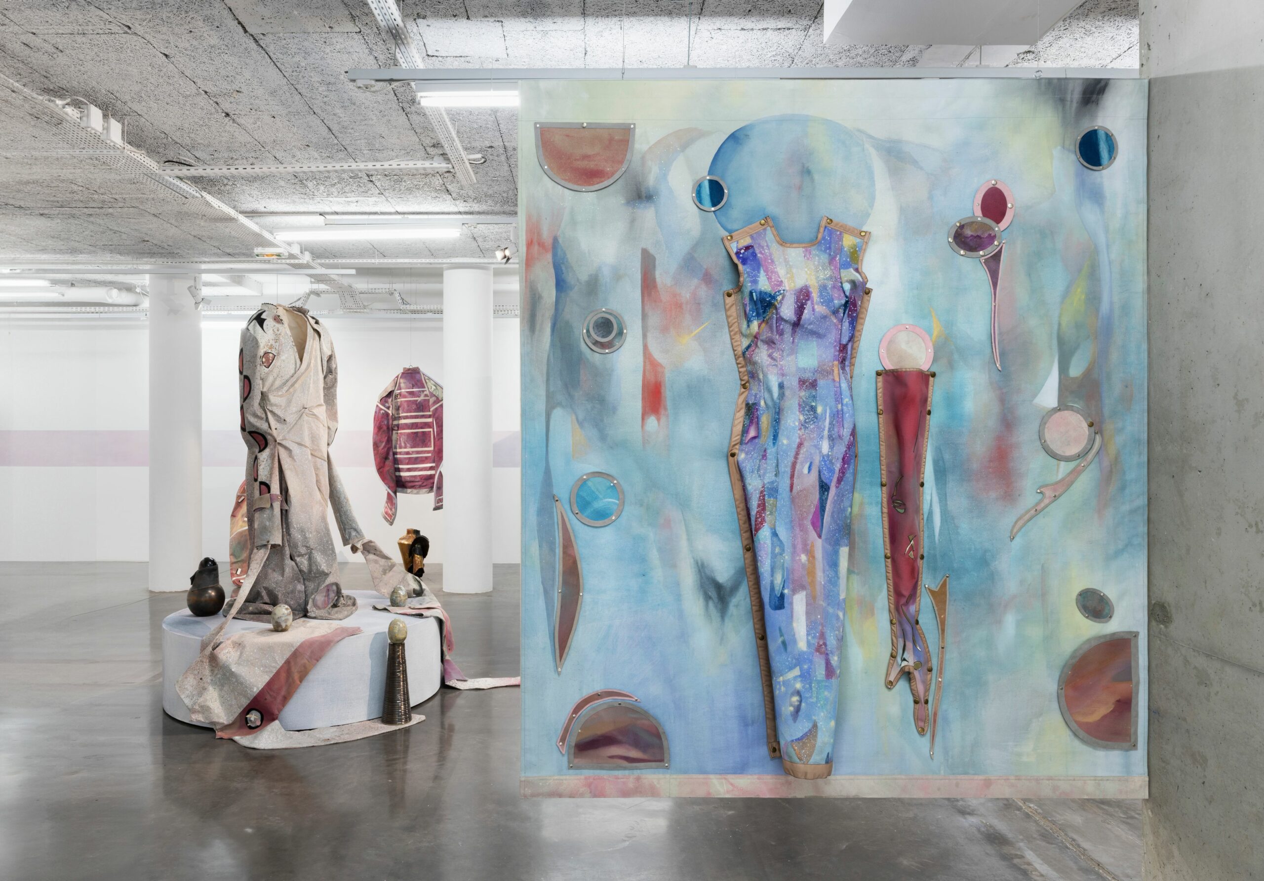 Comprendre l’espace du Plateau du FRAC Île-de-France comme une “scène géante”, c’était déjà toucher à la notion d’échelle de ces anciens studios denregistrement d’émissions de télévision. Si de très nombreuses pièces ont été faites à l’occasion de l’exposition, dans l’idée des volumes du FRAC, Mathilde Denize confie que les proportions sont toujours perçues “au-delà des limites du corps humain afin d’entrer dans un imaginaire forcément plus ouvert”. Pourtant l’objet-maquette n’est jamais véritablement convoqué, ni à l’échelle du lieu en amont de la fabrique de l’exposition, ni dans la confection des œuvres. C’est grâce à cette conception de l’art non finito chère à Mathilde Denize, dessinant une œuvre sans fin, en perpétuelle renaissance, qu’une liberté formelle existe dans ses pièces. La mise en volume de la peinture et des formes avec la modéliste Rosalie Gesta permet d’envisager techniquement “un espace du costume avec davantage de liberté, jusqu’à l’ajout de nombreux détails que l’échelle du corps humain ne permettrait pas”, explique-t-elle. Emprunté au vocabulaire de la scène, le lexique de l’exposition décale ainsi de manière continue l’action et nos regards des espaces du FRAC au centre même d’œuvres, autrement appelées “tableaux-théâtres”.