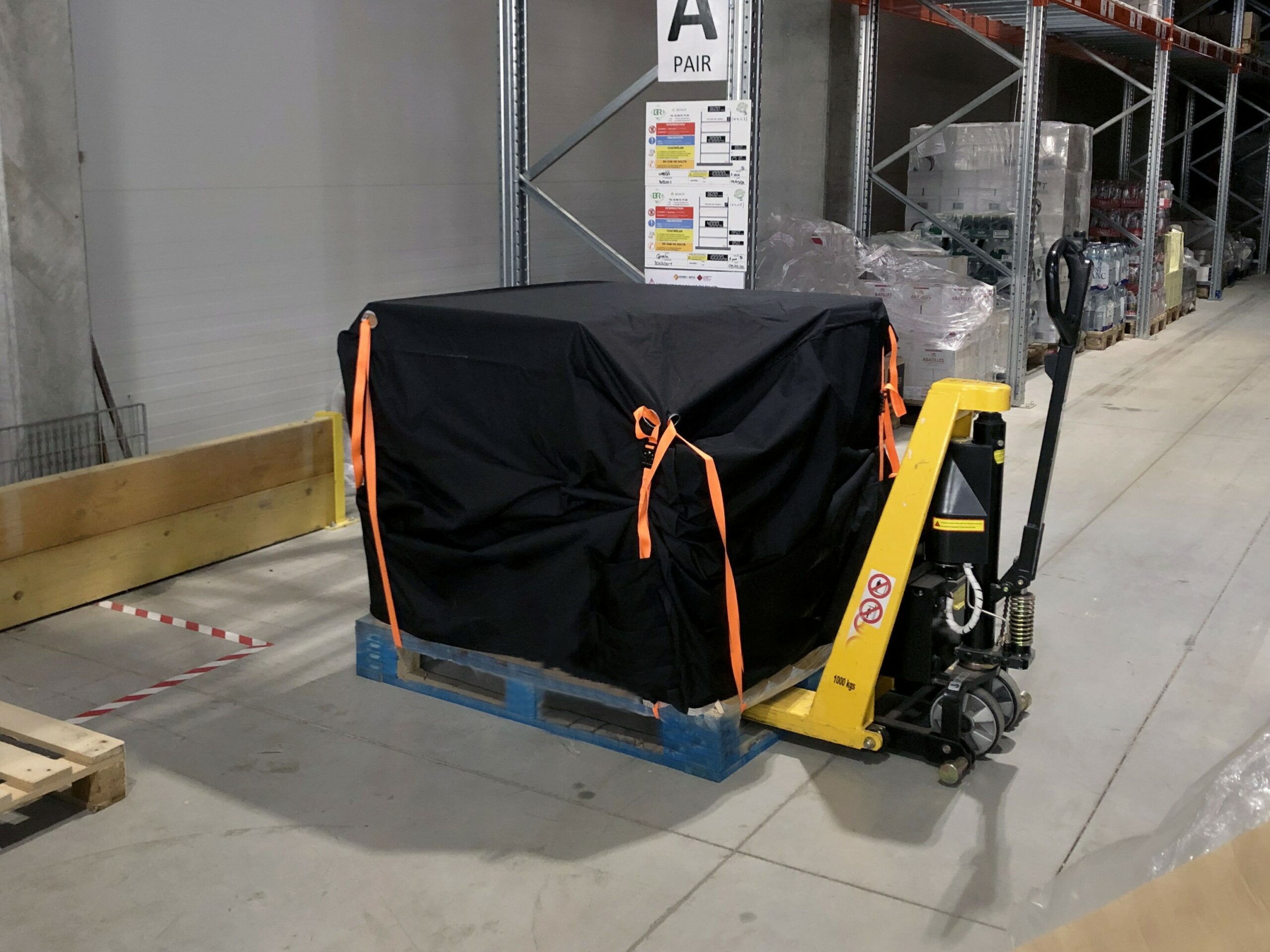 La première solution tout juste sortie, que propose l’Envlhop™ entre dans le cadre de l’emballage de tamponnage. Elle est à l’origine, une solution de stabilisation des marchandises déplacées grâce aux palettes en bois. Ce sont les dimensions de la palette Europe EPAL, standardisées à 80 cm x 120 cm, qui ont finalement donné la première forme de la housse Envlhop™. Le design suit ainsi complètement sa fonction, que ce soit dans ses dimensions, ses matériaux choisis et le placement des sangles de serrage. En prenant en compte l’ensemble des couches liées à l’emballage, la housse d’Envlhop™ se compose d’un feutre en textile recyclé fabriqué à Lille, doublé d’un textile technique spécifique qui garantit la protection déperlante etune résistante face à la déchirure.