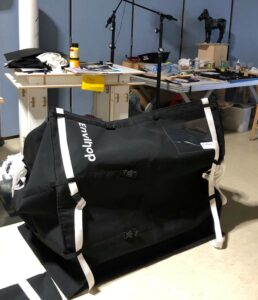 E.K. : Le Studio Xavier Veilhan pousse à l’innovation dans le marché de l’art et participe aux réflexions quant à la réduction de l’empreinte carbone, tant lors de la fabrication d’une œuvre qu’à la mise en exposition. À bord du catamaran fabriqué à base de fibre de lin du navigateur Roland Jourdain, il produit des œuvres à l’aide de machines sans électricité et transporte certaines autres déjà réalisées en vue de l’exposition Do Vento présentée dans la Galeria Nara Roesler de São Paulo. L’expérimentation des réflexions des housses d’Envlhop™ ne pouvait pas être plus belle avec le Transatlantic Studio. Les cinq housses d’Envlhop™ que le Studio Xavier Veilhan a acheté connaissent donc différents usages à la fois lors de la navigation : elles permettent le déplacement des matériaux bruts, protègent les œuvres achevées des projections d’eau lors de la traversée voire des tempêtes. Elles ont été aussi précieuses au moment du débarquement et du transport des œuvres jusqu’à la Galerie d’exposition. L’un des gros enjeux était la rotation des housses qui correspondaient à leurs nombreux usages mais elles continueront d’accompagner la logistique de Xavier Veilhan au quotidien, au-delà de ce voyage évidemment je l’espère.