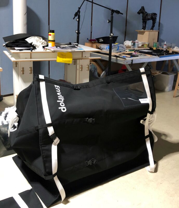 La première solution tout juste sortie, que propose l’Envlhop™ entre dans le cadre de l’emballage de tamponnage. Elle est à l’origine, une solution de stabilisation des marchandises déplacées grâce aux palettes en bois. Ce sont les dimensions de la palette Europe EPAL, standardisées à 80 cm x 120 cm, qui ont finalement donné la première forme de la housse Envlhop™. Le design suit ainsi complètement sa fonction, que ce soit dans ses dimensions, ses matériaux choisis et le placement des sangles de serrage. En prenant en compte l’ensemble des couches liées à l’emballage, la housse d’Envlhop™ se compose d’un feutre en textile recyclé fabriqué à Lille, doublé d’un textile technique spécifique qui garantit la protection déperlante etune résistante face à la déchirure.