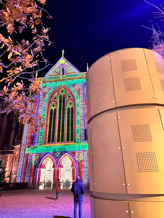 Tour Media et vidéo mapping, collégiale Saint Martin à Colmar – Bureau d’études éclairage Vialis – Photo © Concept Light