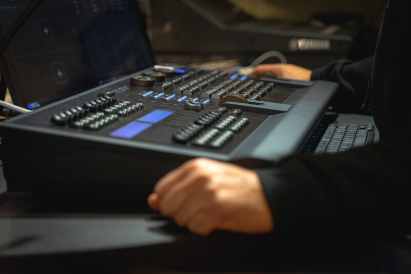 En régie, un Ion Xe 20 de la gamme EOS prend le contrôle. Compacte, dotée de vingt faders, la console permet de piloter couleurs, réseaux DMX/sACN, Art-Net et automatiques sans changer de “grammaire” d’un plateau à l’autre. Avec l’arrivée des mouvements et de la LED, la console n’est plus seulement une boîte à faders – même si l’importance de ces derniers ne se discute pas –, elle s’instaure comme centre névralgique de commande : presets, bibliothèques, mémoires et cue lists concentrent désormais une bonne part de la magie du spectacle. La montée en compétences s’appuie sur la chaîne YouTube d’ETC et ses webinaires facilement accessibles, que l’équipe peut suivre directement depuis la régie, leur nouvelle console sous la main.