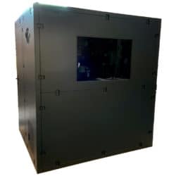 Cabine de projection de cinéma, mobile et facilement démontable avec une isolation phonique et vitrage adapté aux contraintes cinématographiques. Ces portes sont de même constitution